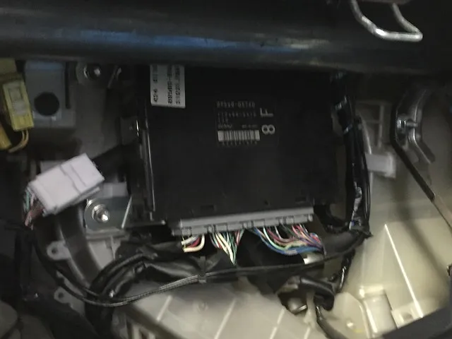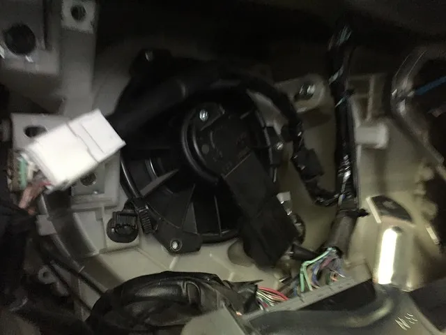 助手席前のグローブボックス(物入れ)を外すと、コンピューターのBOX(いくつか配線がつながっている黒くて四角い箱)が見えます。この奥にブロアモーターがあります。